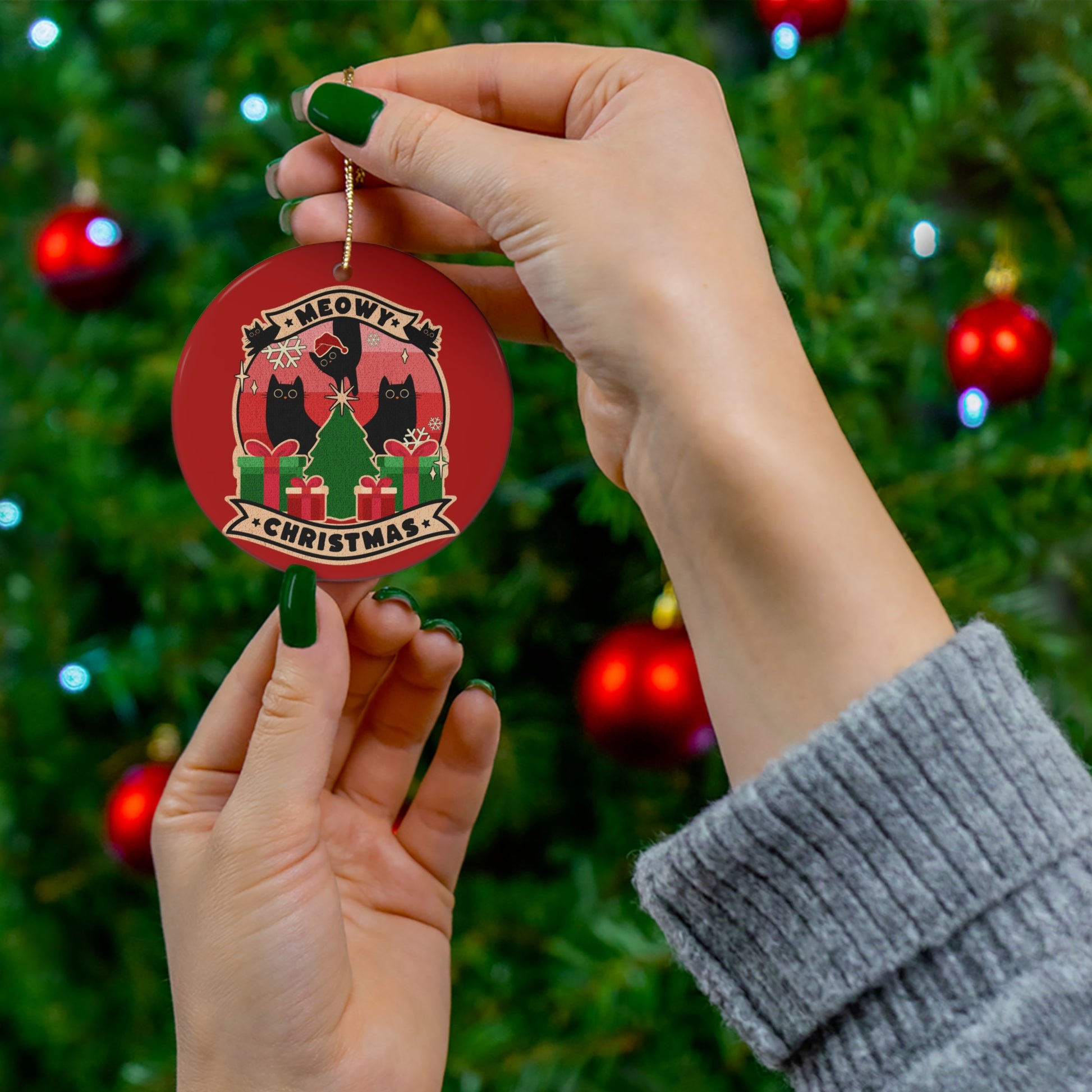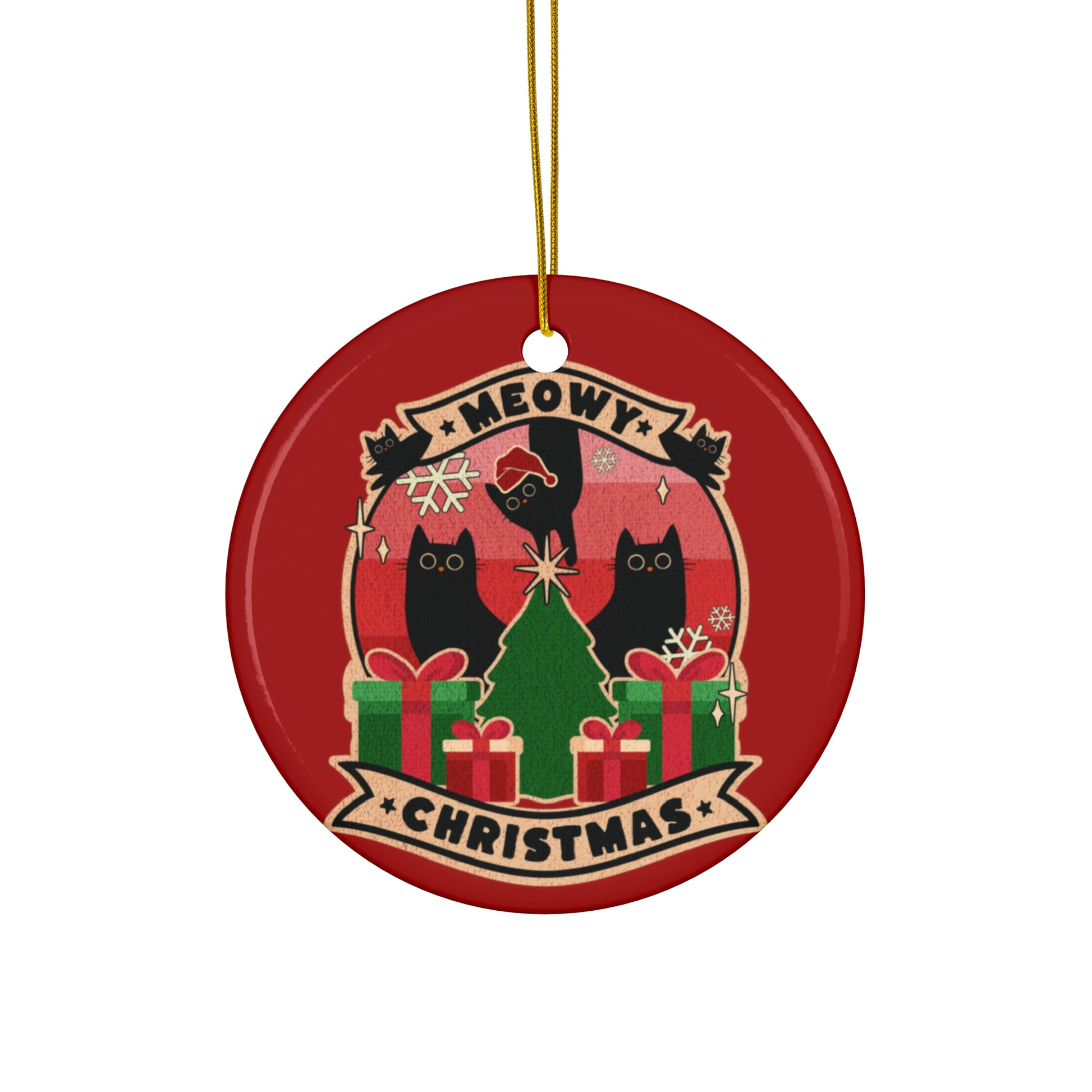 This high-quality ceramic ornament is perfect for any cat lover's Christmas tree. It features a glossy finish and a one-sided print of a festive "Meowy Christmas" cat. The 0.125" thickness and included gold-toned hanging string make it easy to display and add a touch of holiday cheer to your home.